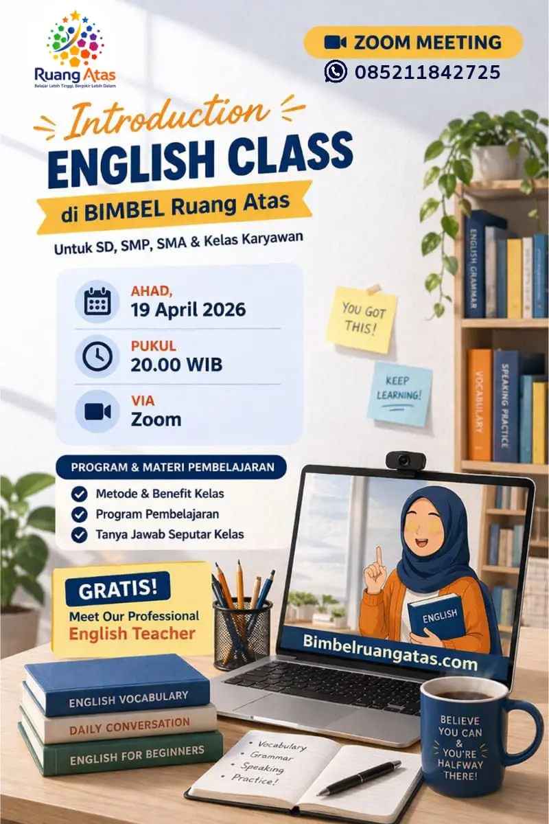 Apakah Anda ingin meningkatkan kemampuan bahasa Inggris Anda? Atau mungkin Anda sedang mencari cara yang efektif untuk mempelajari bahasa internasional ini? Jika iya, kami punya kabar baik untuk Anda! Bimbel Ruang Atas dengan bangga mempersembahkan webinar gratis berjudul "Introduction: English Class" yang akan diselenggarakan pada Ahad, 19 April 2026, mulai pukul 20:00 WIB.